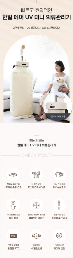 제가 선택한 한일전기 에어 UV 미니 의류관리기는 **[용량: 예: 3kg, 5kg]**의 소형 건조기로, 협소한 공간에도 쏙 들어가는 콤팩트한 디자인이 특징입니다. 단순히 건조만 되는 것이 아니라, 에어 송풍 기능과 강력한 UV 램프가 탑재되어 있어 살균까지 한 번에 해결할 수 있는 스마트한 의류관리기예요.