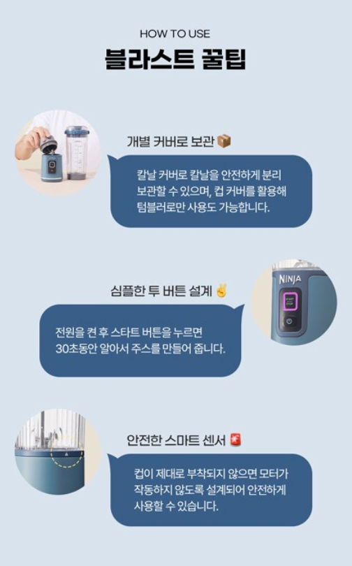 | 부가 기능 | USB-C 타입 충전, BPA Free 텀블러 | 분쇄기, 얼음 분쇄 가능 | 텀블러 2개, 다지기 액세서리 포함 |