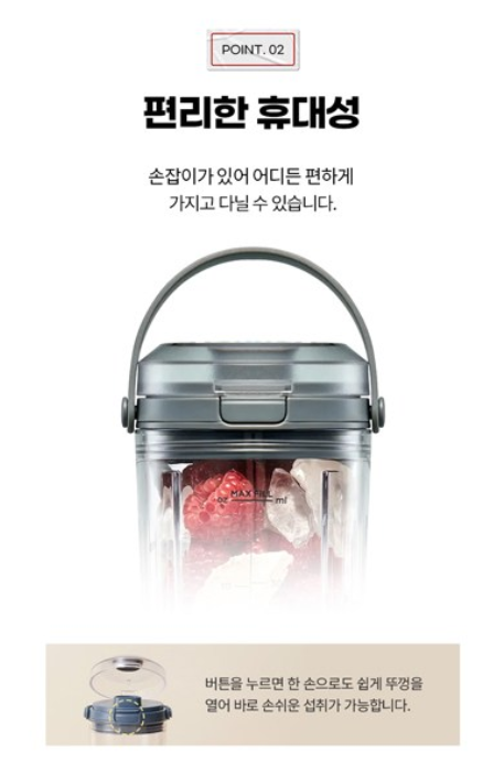 | 추천 대상 | 캠핑, 여행 등 야외활동을 자주 하는 분 | 대용량 블렌딩이 필요한 분, 단단한 재료 분쇄가 많은 분 | 소량 조리가 많은 분, 이유식 등 다지기 기능이 필요한 분 |