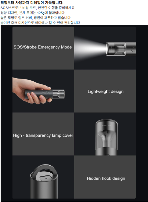 어둠 속의 한 줄기 빛, 만능 아이템<br>1000루멘의 밝기를 자랑하는 강력한 손전등입니다. 일반 손전등 기능 외에도, 측면 조명, 비상 깜빡이, 비상용 보조배터리 기능까지 갖추고 있습니다. |