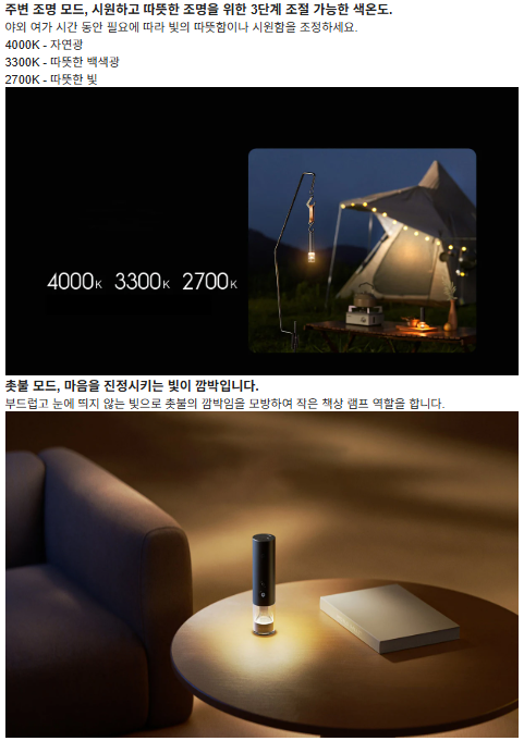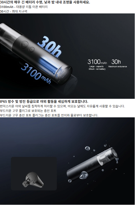 30시간 지속되는 긴 배터리 수명<br>완충 시 최대 30시간 동안 사용할 수 있어 캠핑, 등산 등 장시간 야외 활동에도 든든합니다. 마그네틱 기능으로 차량 정비나 어두운 작업 환경에서 유용하게 사용할 수 있습니다. |
