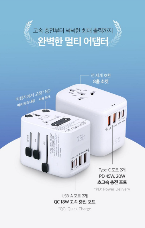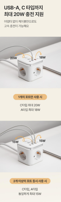 | 주요 특징 | 큐브형 디자인, USB 고속 충전 포트 | 해외여행용, GaN 초고속 충전 | 두꺼운 전선, 높은 안전성 |