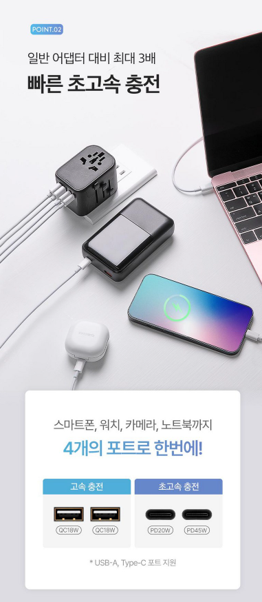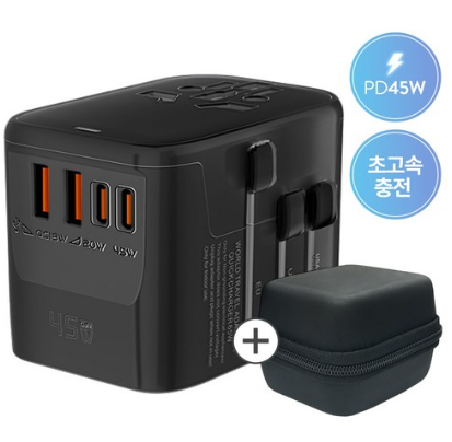 해외여행이나 출장이 잦은 분들에게 정말 유용한 제품입니다. 다양한 국가의 콘센트 규격을 지원하는 어댑터와 USB 고속 충전 포트가 모두 포함되어 있어 이 제품 하나면 짐을 확 줄일 수 있어요. GaN 기술을 적용해 크기는 작으면서도 초고속 충전이 가능해서 여행 중에도 배터리 걱정 없이 전자기기를 사용할 수 있습니다.