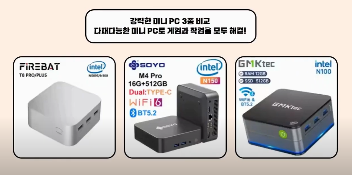 오늘 비교해 볼 미니 PC 삼대장은 바로 GMKtec NucBox G2 (인텔 N100), SOYO 미니 PC (인텔 N150), 그리고 **FIREBAT T8 Pro Plus (인텔 N5095)**입니다. 과연 어떤 미니 PC가 여러분에게 딱 맞을지, 지금부터 자세히 살펴보겠습니다!