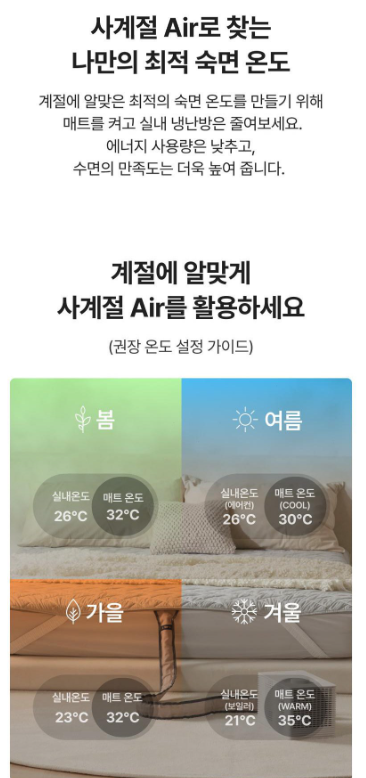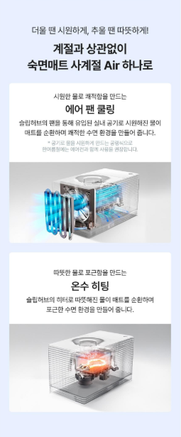 - 추가 기능: 침구 건조 기능은 습기 제거에 유용하여 사계절 쾌적한 매트 관리가 가능합니다.